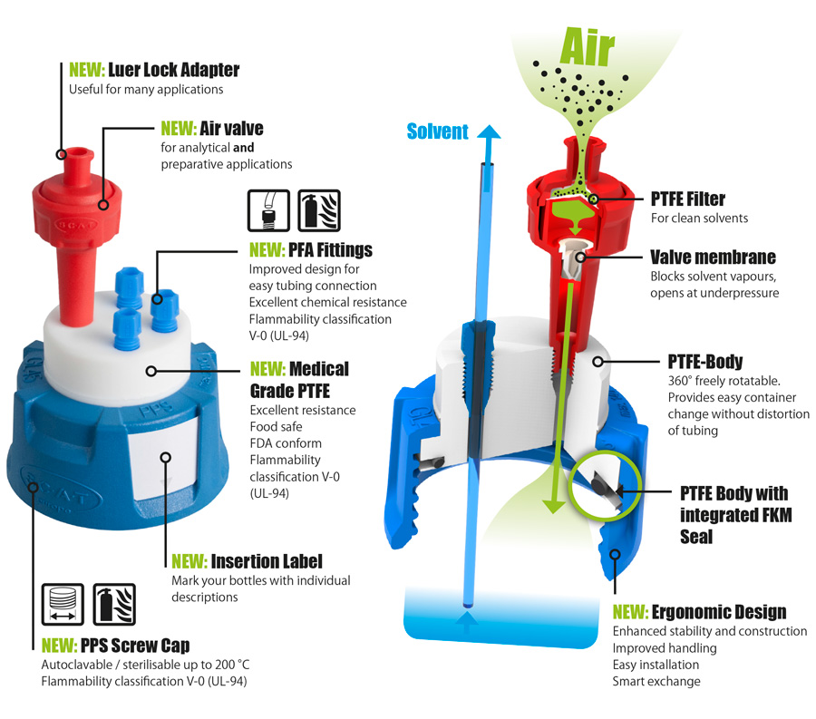 The new, improved air valve combines valve and filter functions. As usual, ventilation occurs during removal; harmful solvent vapors are blocked. At the same time, the valve membrane absorbs dust and contaminant particles from the incoming air. The valve also fits your existing S.C.A.T. SafetyCaps without any technical modification.