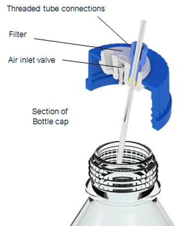 Reduce exposure to hazardous chemical vapours with Vaplock solvent reservoir caps. Minimizing evaporation, an integrated check valve permits air to enter the bottle for vacuum displacement while solvent is pumped to the instrument. A 50µm PTFE Filter covers the valve assembly to reduce particulates.