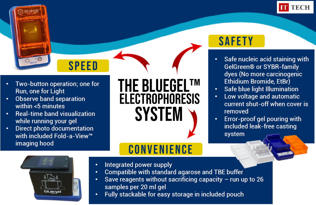• By integrating gel electrophoresis and blue light trans-illumination into an all-in-one device, you can see results instantly while still running your gel.
